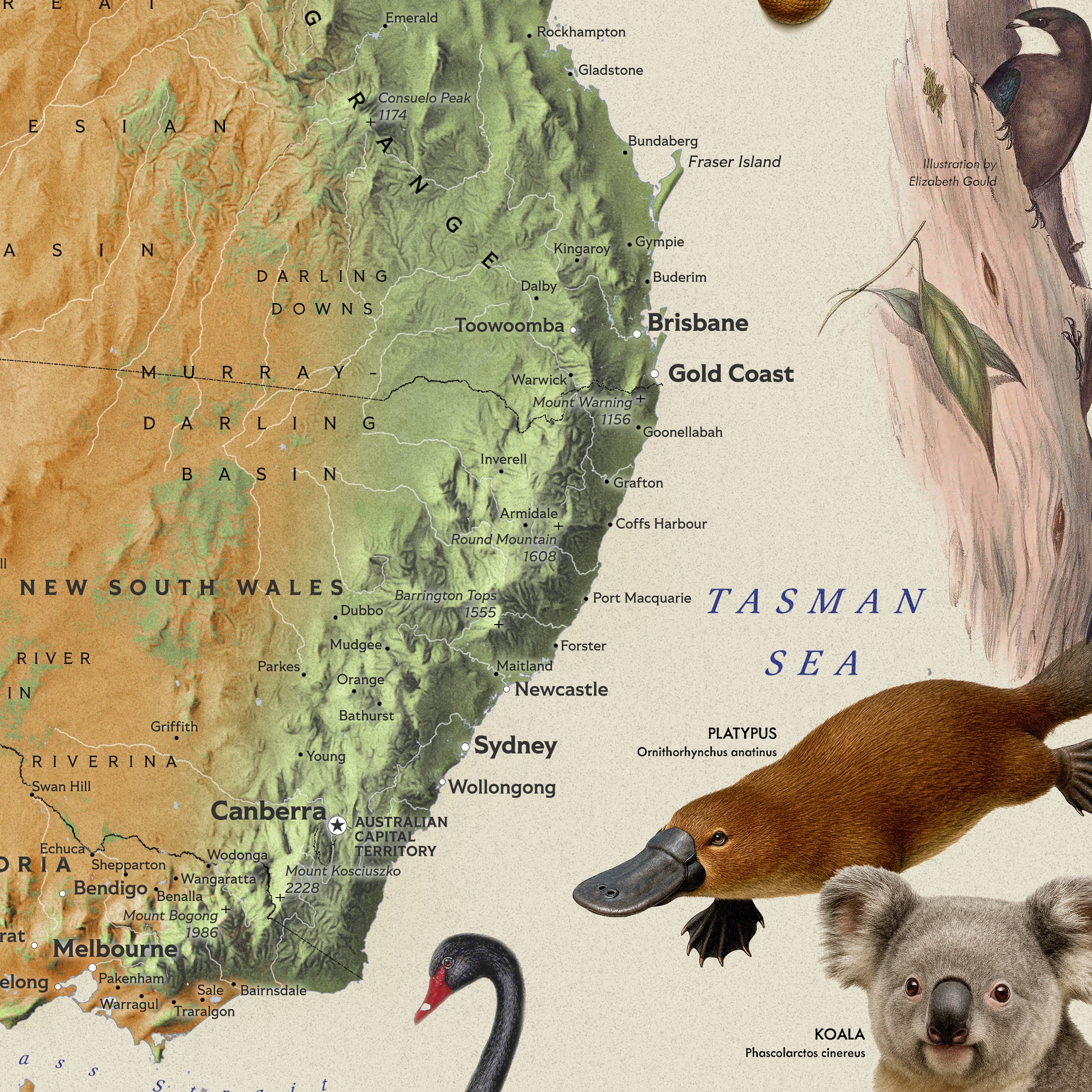 The map combines detailed terrain rendering with illustrations of native wildlife, creating a quiet portrait of the continent’s landscapes and ecosystems. Printed with fine tonal contrast and a warm, natural palette, it’s both decorative and informative — a modern interpretation of traditional cartography.