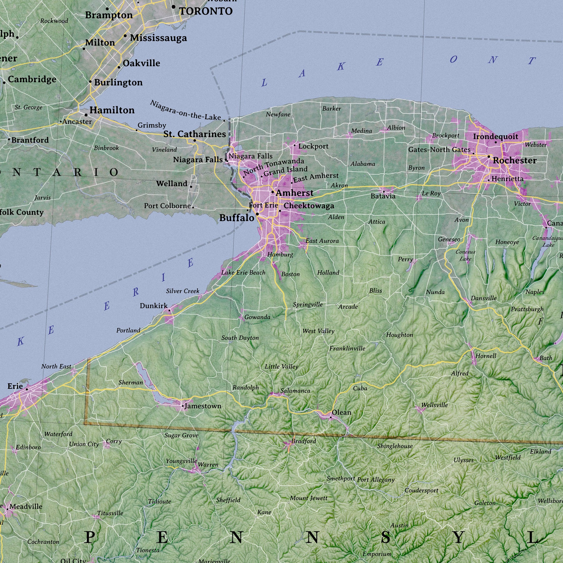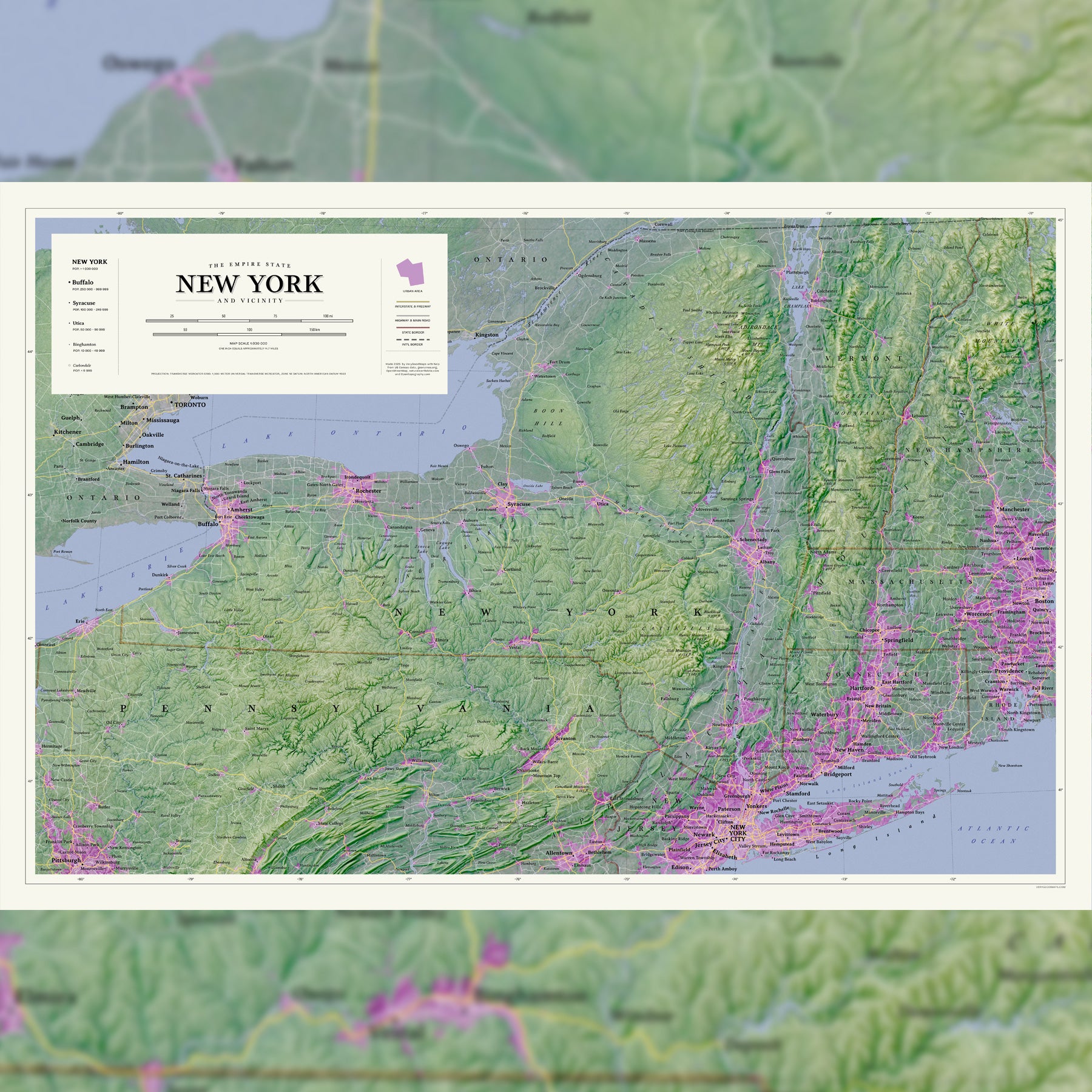 Expansive Coverage: Captures the complete state of New York along with key surrounding regions: New Jersey, Pennsylvania, Connecticut, Massachusetts, Vermont, and Southern Ontario.
