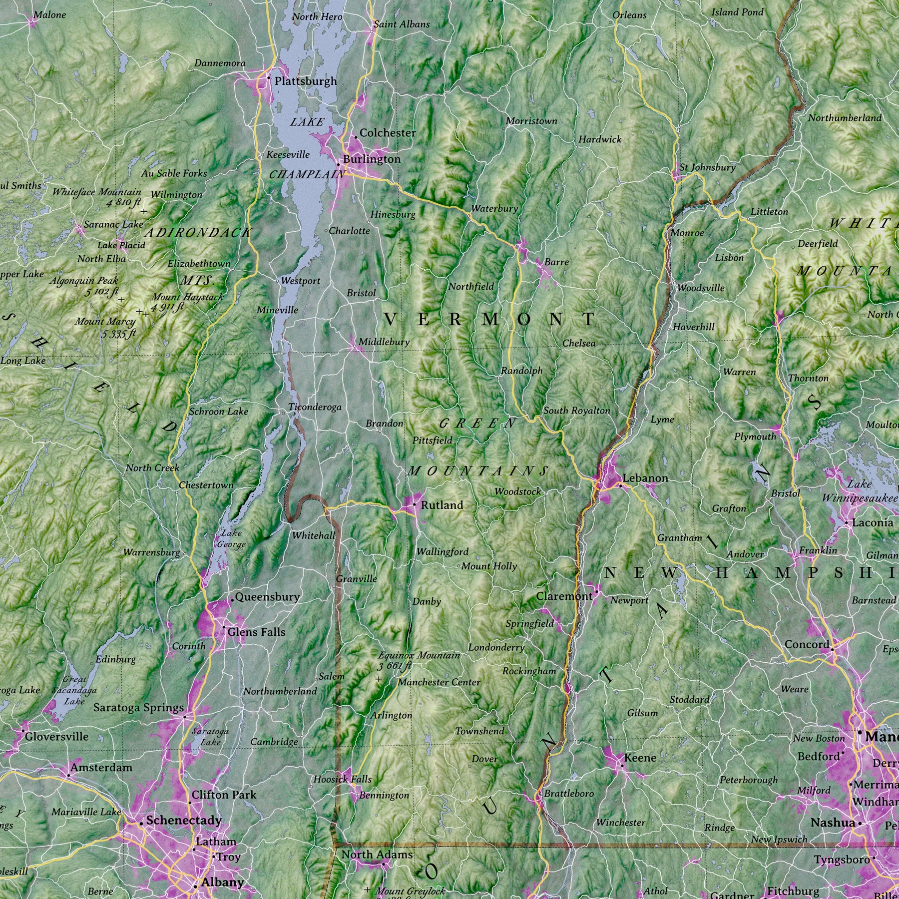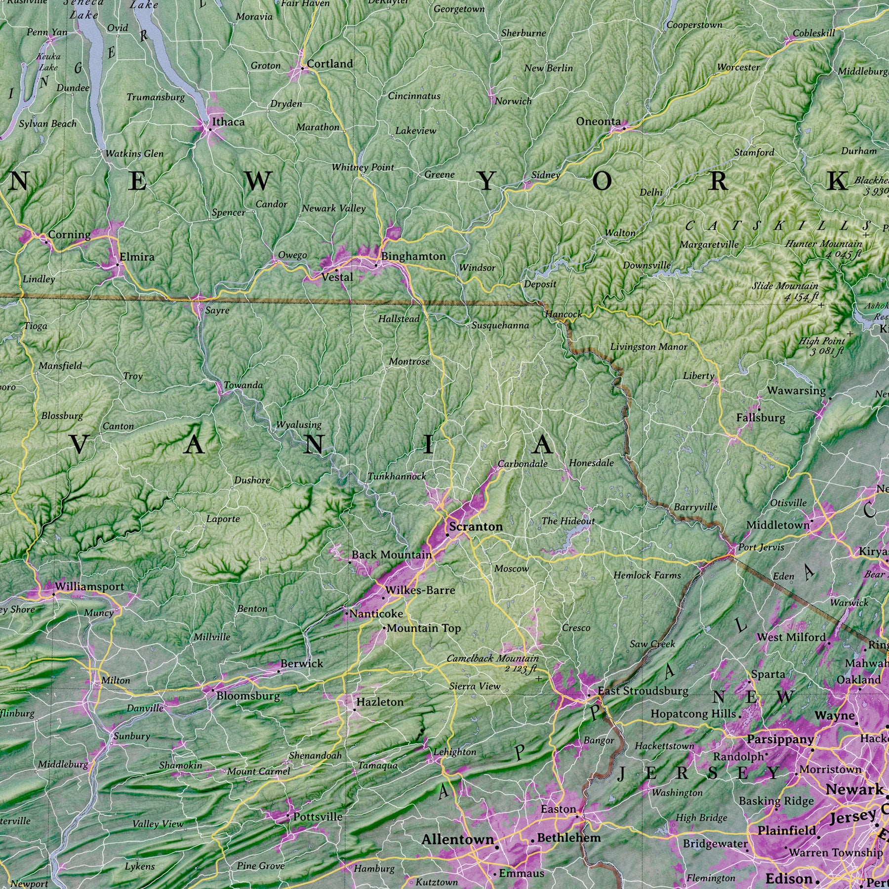 The map features a rich, artistic elevation color scheme—distinguishing the high peaks of the Adirondacks and Catskills from the valleys of the Hudson and Mohawk—creating a vibrant picture of the Northeast's physical geography.