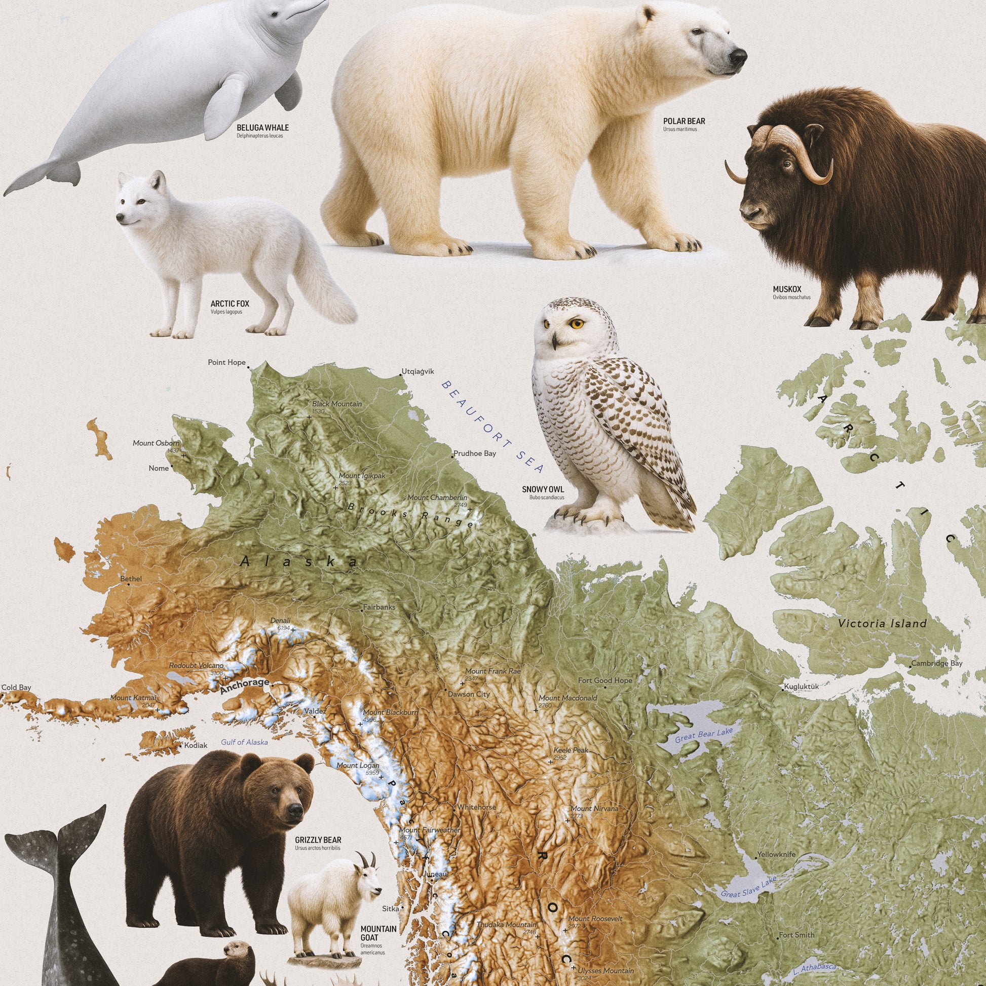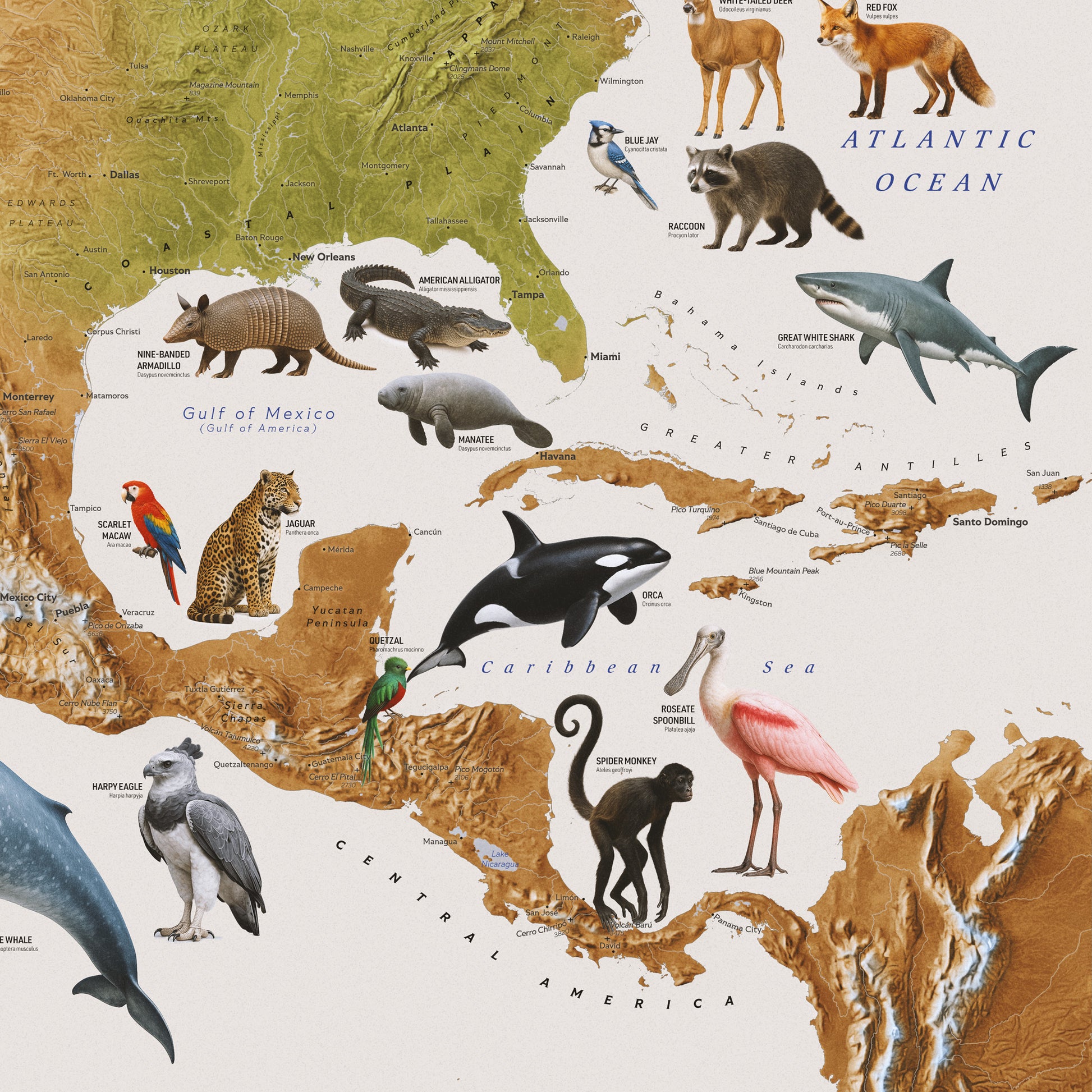 The map depicts the continent’s major landforms and waterways with finely modeled terrain, complemented by illustrations of characteristic wildlife from the Arctic tundra to tropical forests. Each species and feature was selected to reflect the diversity of North America’s landscapes — from mountains and coasts to plains and deserts.