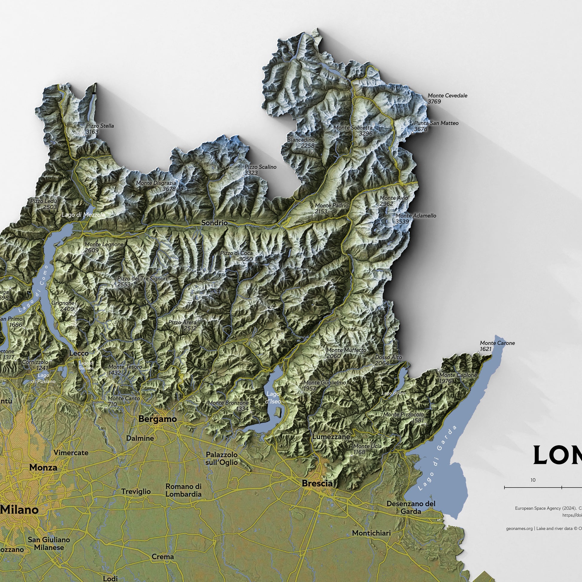 Experience Lombardia through this stunning shaded relief map that brings the dramatic topography to life. Unlike typical modern shaded relief wall maps, this combines artistic beauty with practical information, making it perfect for both decoration and reference.