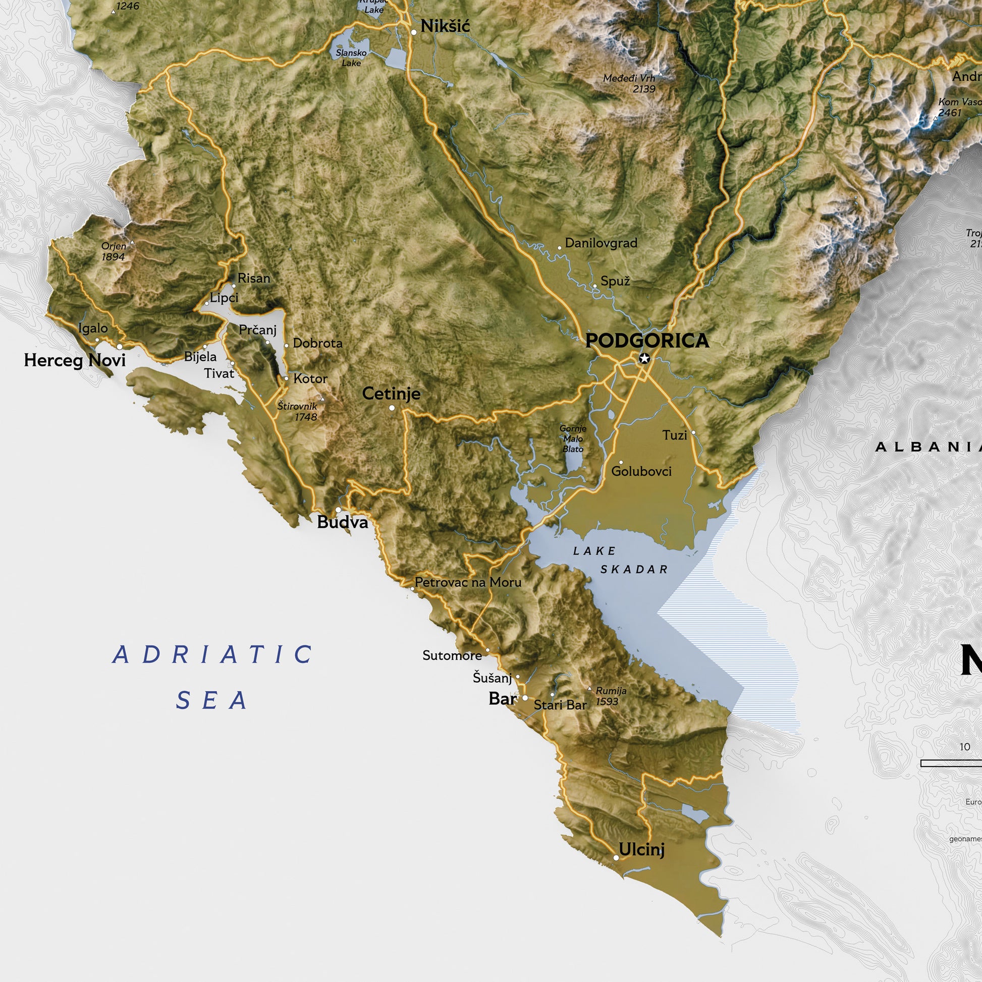 Experience Montenegro through this stunning shaded relief map that brings the dramatic topography to life. Unlike typical modern shaded relief wall maps, this combines artistic beauty with practical information, making it perfect for both decoration and reference.