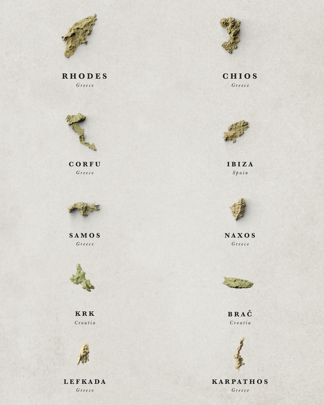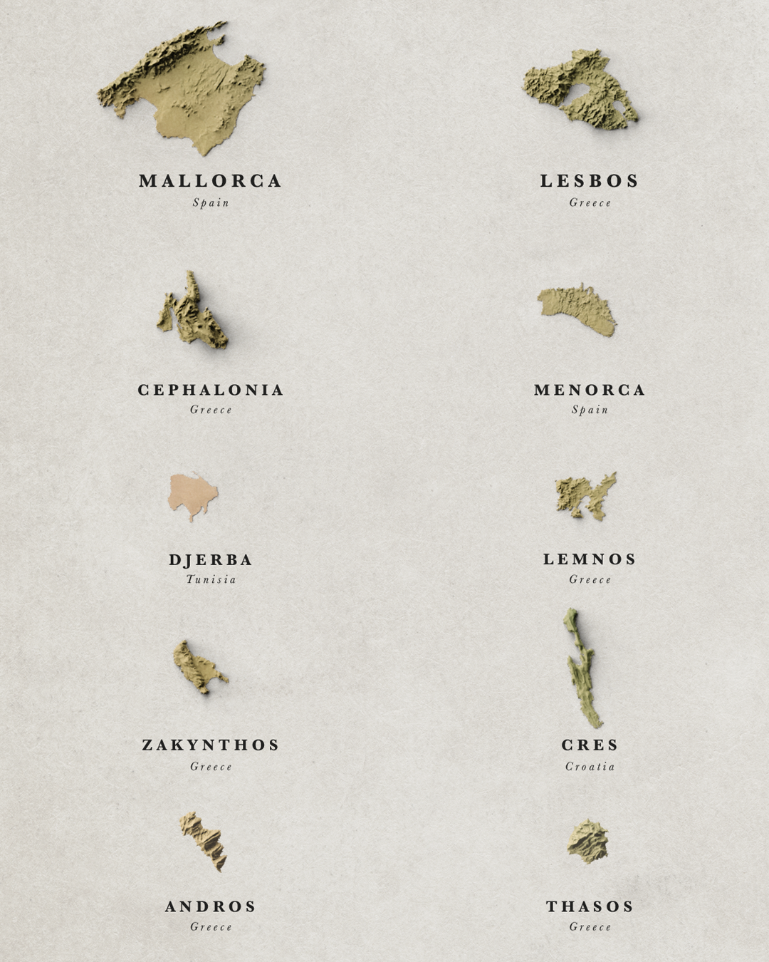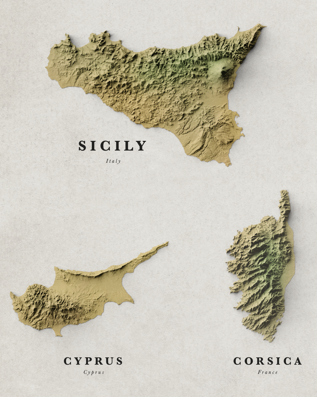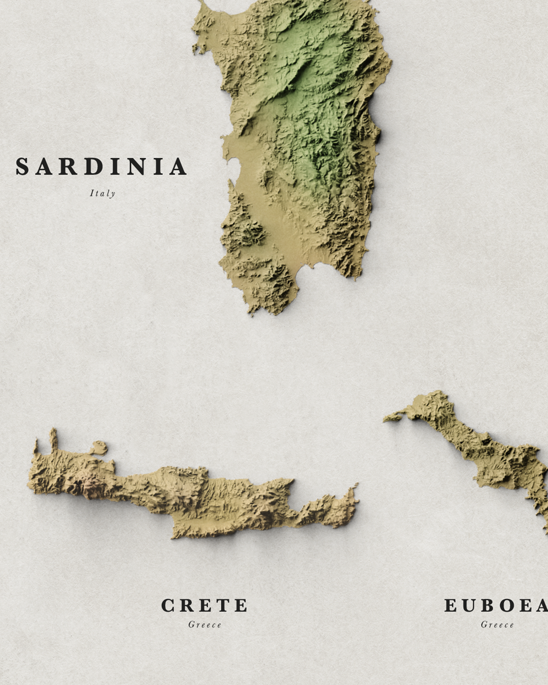 Shaded Relief Map of the 30 largest Mediterranean Islands (50x70 cm)
