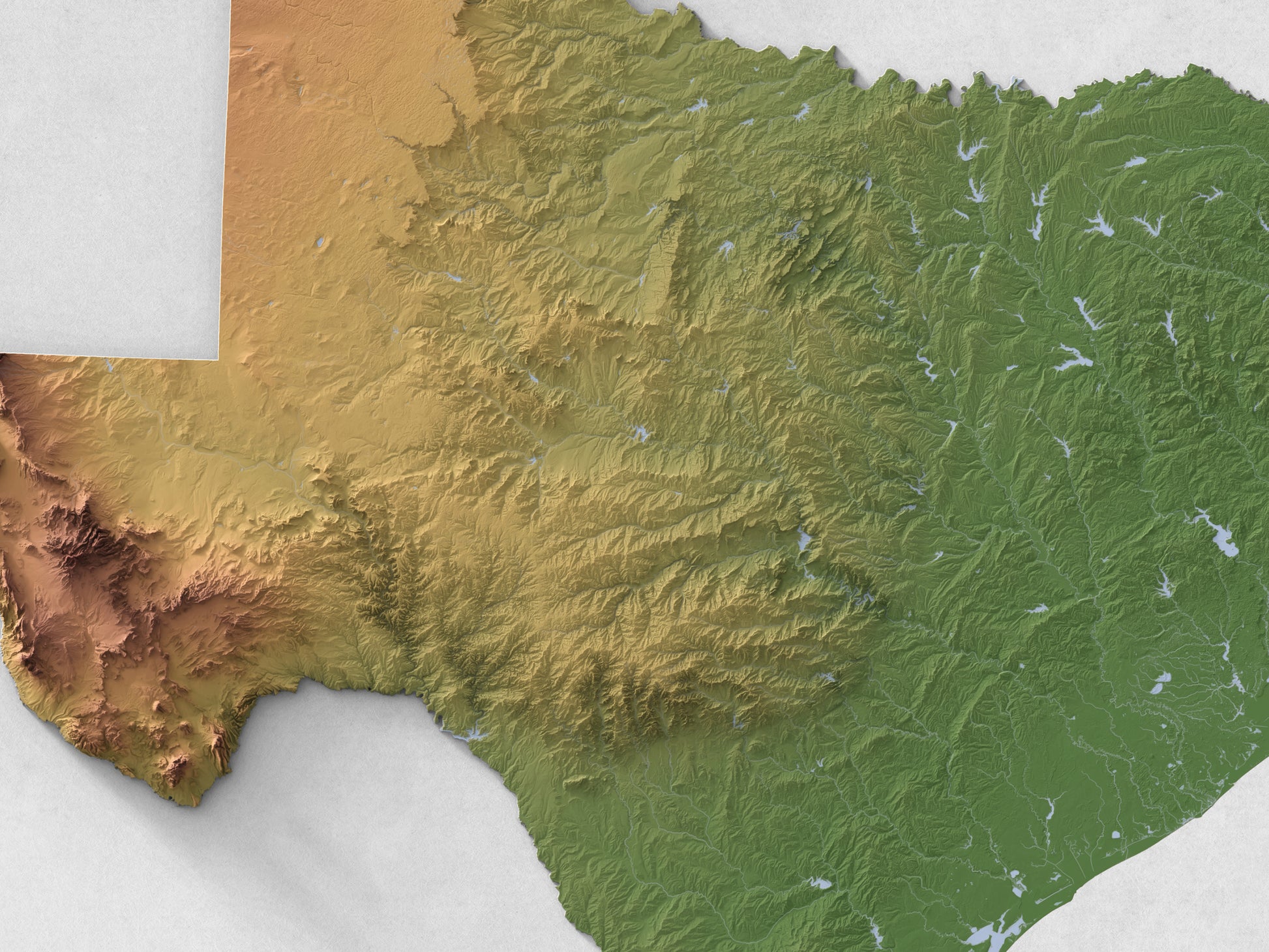 Experience Texas through this stunning shaded relief map that brings the state's topography to life. This clean, unlabeled design focuses entirely on the natural beauty of the landscape—perfect for those who appreciate minimalist geography and artistic wall decor.