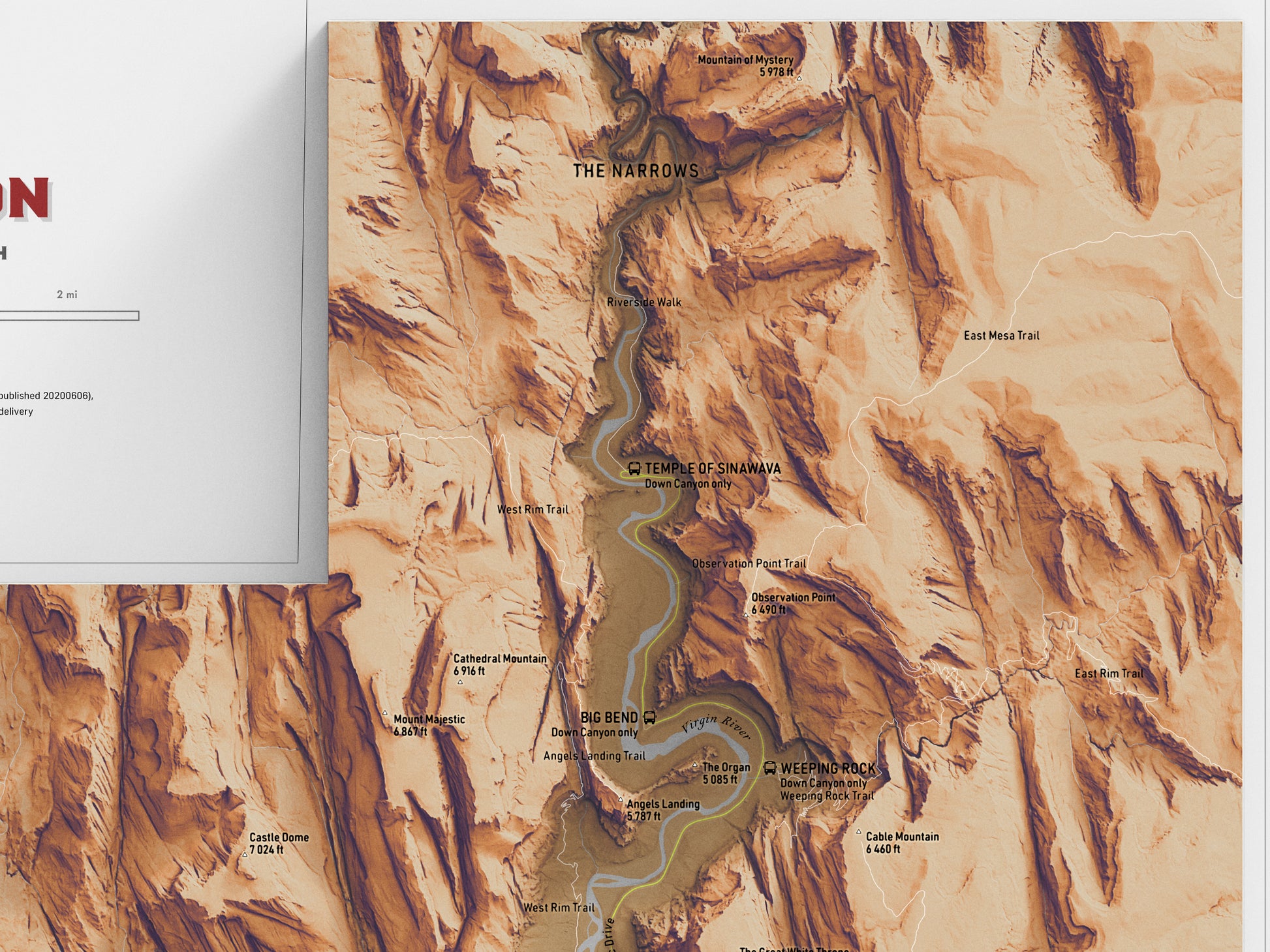 Experience Zion Canyon through this stunning shaded relief map that brings the dramatic topography to life. Unlike typical wall maps, this combines artistic beauty with practical information, making it perfect for both decoration and reference.